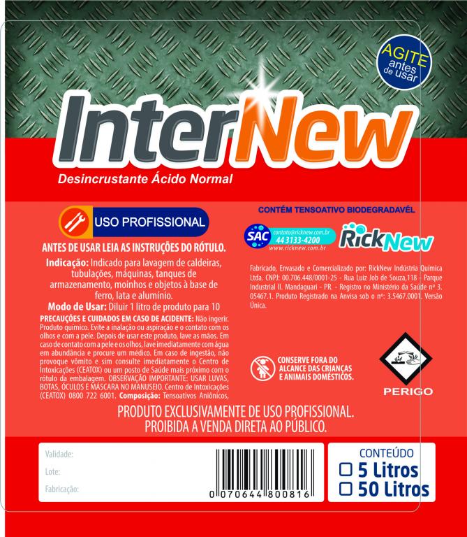 Internew ou Intercap Normal/Limpa Baú - 1 X 10 é um produto que contém tensoativo biodegradável e é usado para lavagem de veículos, chassis, motores, máquinas e instalações industriais, além de equipamentos em geral. É um produto de ação rápida e eficiente, que elimina grande parte da mão-de-obra. Produto ácido, em alta concentração, com ação eficaz contra sujidades inorgânicas. Deve ser aplicado após o agir do Solupan.