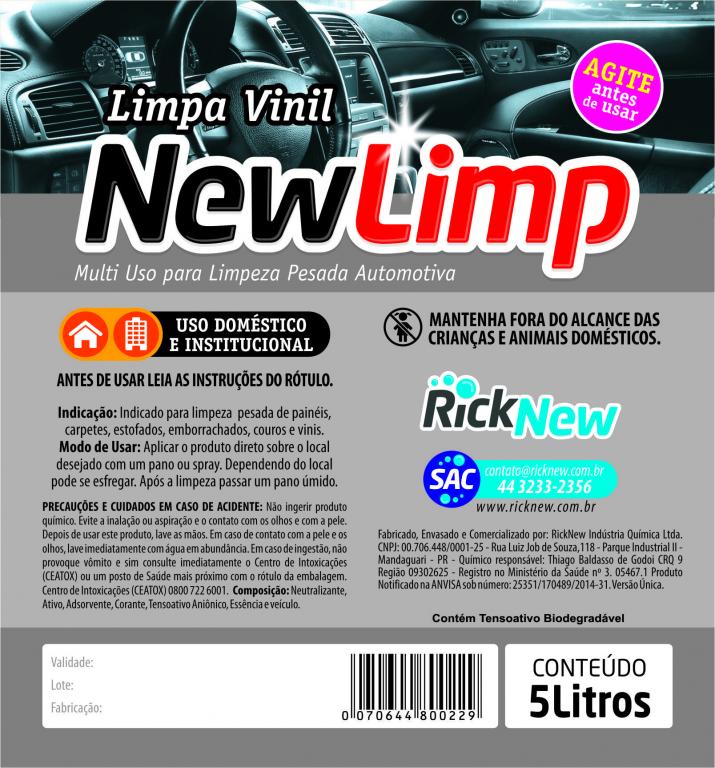 Limpa Vinil – New Limp, aparentemente é o mesmo produto que o multi uso, mas a diferença está em sua composição, pois as matérias-primas são mais finas, tornando o produto com um pH neutro e por isto pode ser utilizado em couro, corvin, corino, metais, plásticos, sofás, cartpet, alumínio, utensílios, móveis e eletrodomésticos e ainda é indicado para limpeza interna de veículos, limpando com facilidade qualquer superfície sem que crie manchas ou esbranquice o objeto da limpeza. Apresenta também grande poder de limpeza sobre gorduras. Utiliza- se este produto puro, diluido ou concentrado na limpeza de máquinas industriais.