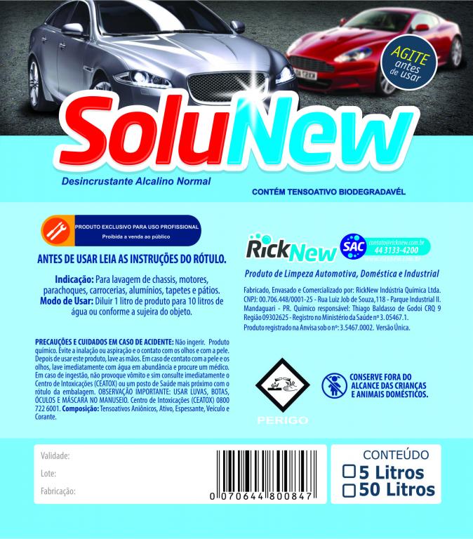Solupan Normal ou Solunew Normal 1 X 40 é um produto com tensoativo biodegradável e usado para lavagem de chassis e motores de veículos, além de pátios sujos de óleo e graxas e equipamentos em geral. Produto com alta concentração em matérias-primas de ponta, proporcionando pouco cheiro na sua aplicação, diferente do Solupan Normal ou Solupan Concentrado que possui neles o odor do Hidróxido de Sódio (Soda), entretanto tem nele outro componente no lugar da soda que limpa e não deixa aquele cheiro desagradável.
